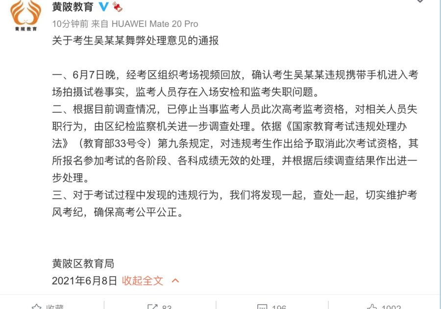 武汉市黄陂区教育局官方微博@黄陂教育关于考生吴某某舞弊处理意见的通报:一、6月7日晚,经考区组织考场视频回放,确认考生吴某某违规携带手机进入考场拍摄试卷事实,监考人员存在入场安检和监考失职问题。
