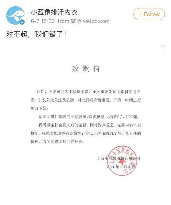 据正观新闻6月7日报道,针对“用甘肃白银越野赛事故图片做宣传”一事,小蓝象排汗内衣官方微博发布致歉声明,称因该司门店画面素材使用不当,引发公众质疑,已进行整改下架;基于此事件带来的不良影响,深表歉意。