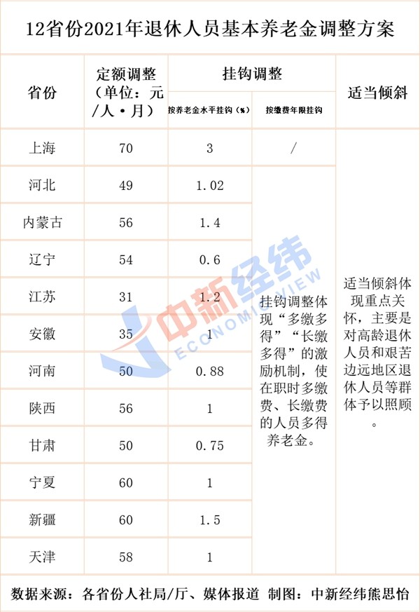 据不完全统计,截至目前,河北、内蒙古、辽宁、上海、天津、江苏、安徽、河南、陕西、甘肃、宁夏、新疆12省份已公布2021年退休人员基本养老金调整方案。有你的省份吗?来算算你能多领多少钱?