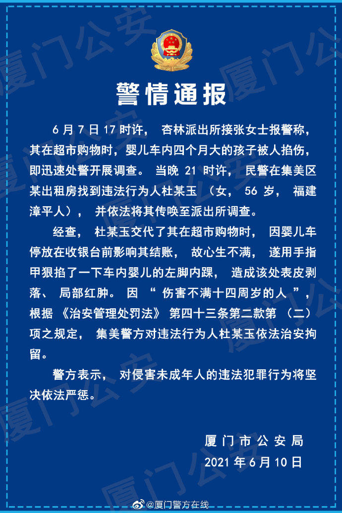 @厦门警方在线消息,6月7日17时许,杏林派出所接张女士报警称,其在超市购物时,婴儿车内四个月大的孩子被人掐伤,即迅速处警开展调查。当晚21时许,民警在集美区某出租房找到违法行为人杜某玉(女,56岁,福建漳平人),并依法将其传唤至派出所调查。