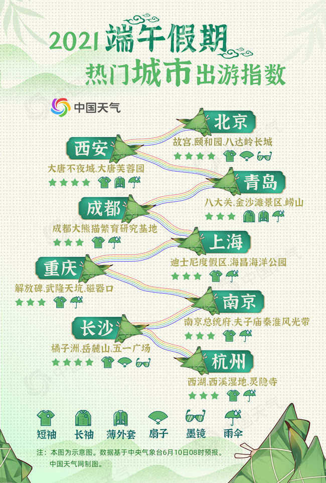 从天气来看,上海、杭州、南京、重庆、成都等地在端午假期多阴雨天气,出行需备好雨具;西安在假期前两天以多云天气为主,气温较高,14日则转为小雨天气,打算前往西安的小伙伴,短袖、外套、雨具、防晒用品一样都不能少;青岛假期后两天有小雨,且气温相对较低,小伙伴有意去海边的尽量安排在12日,并且带件防风外套;长沙、北京整个假期都以多云天气为主,最高气温均超过30℃,出游要注意防晒补水。