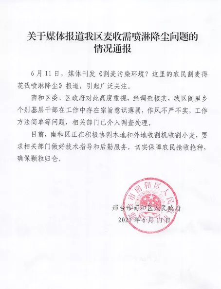 原标题《关于媒体报道我区麦收需喷淋降尘问题的情况通报》