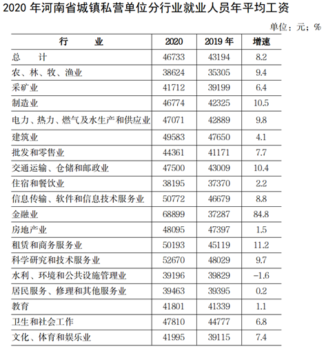 2020年全省城镇私营单位就业人员年平均工资46733元,与2019年的43194元相比增加3539元,同比增长8.2%。