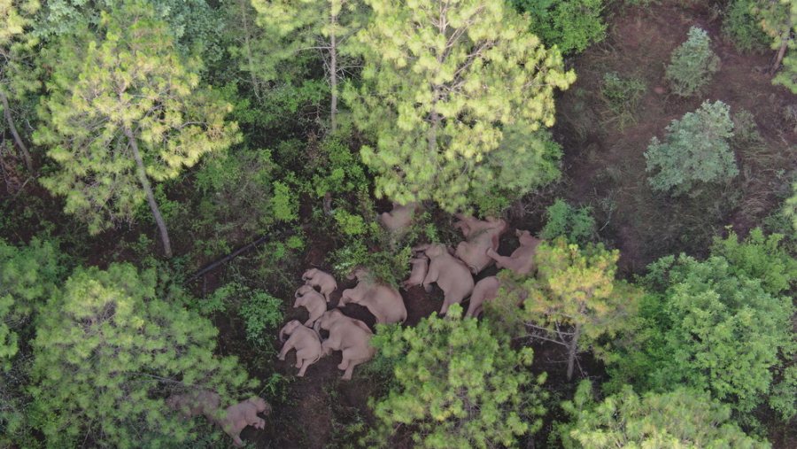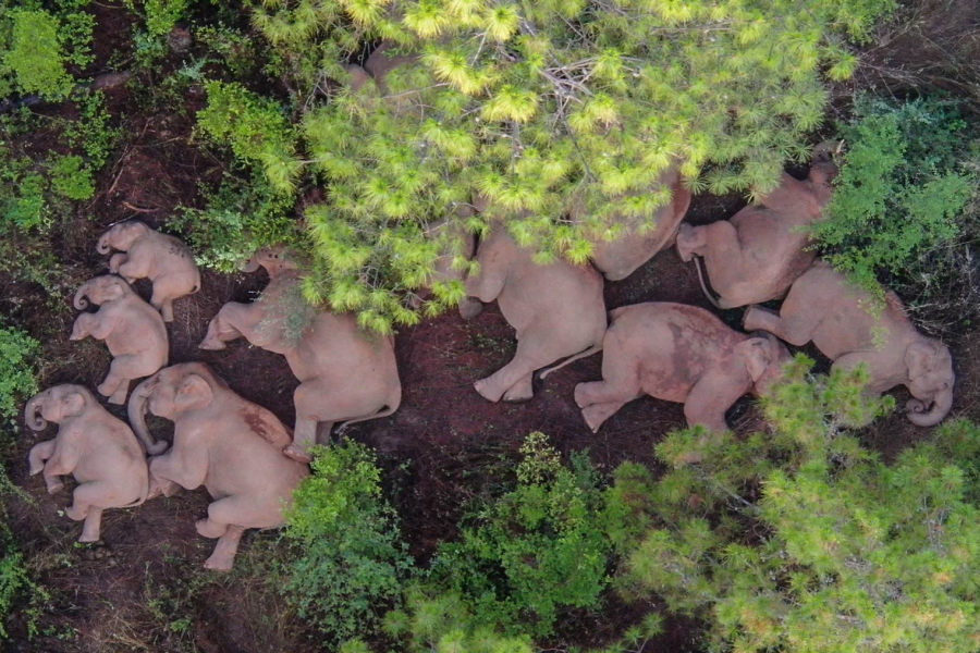6月12日17时30分至13日18时,象群持续在玉溪市易门县十街乡小范围迂回活动,图为象群在林间休息。 森林消防供图