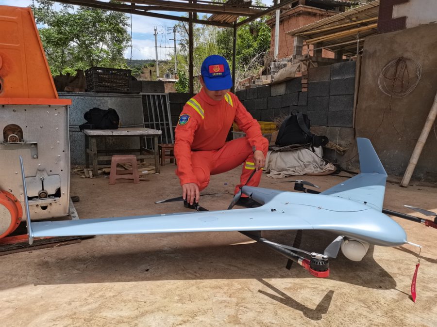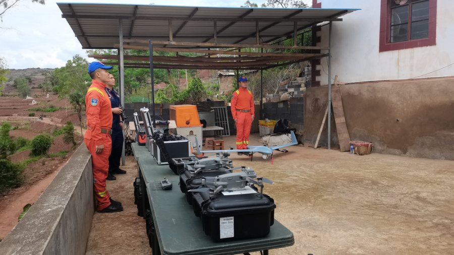 森林消防总队搜寻亚洲象的队员和能夜间拍摄亚洲象热成像的无人机。 澎湃新闻记者 王万春 图