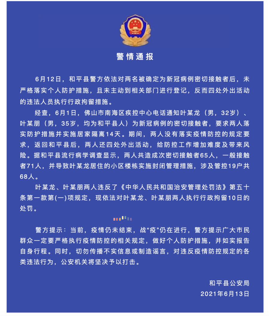 6月13日下午,广东河源和平县委宣传部公众号“和平发布”发布警情通报:6月12日,和平县警方依法对两名被确定为新冠病例密切接触者后,未严格落实个人防护措施,且未主动到相关部门进行登记,反而四处外出活动的违法人员执行行政拘留措施。