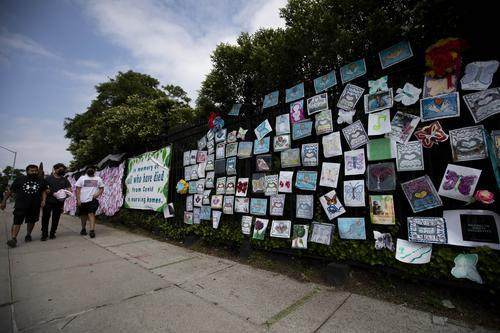 6月14日,行人从美国纽约一处墓地外为新冠死者设立的纪念装置旁走过。新华社发