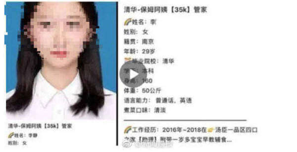 5月25日,上海佑杰家政服务有限公司在社交网络平台上发布了一则应聘信息,标题“清华-保姆阿姨【35k】管家”引人注目。据该求职消息,应聘者李静今年29岁,毕业于清华大学,本科学历,正寻求合适家庭担任管家工作,期待月薪3.5万元。