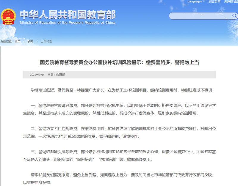 据教育部官网16日发布的《国务院教育督导委员会办公室校外培训风险提示:缴费套路多,警惕勿上当》👇