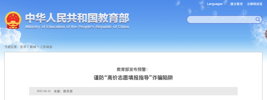 教育部:谨防“高价志愿填报指导”诈骗陷阱
