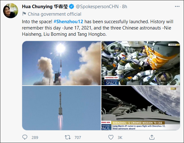 华春莹发布了四张神舟十二号任务图片,并发推写道:“进入太空!神舟十二号成功发射,历史会记住这一天——2021年6月17日,以及三名中国航天员——聂海胜、刘伯明和汤洪波。”