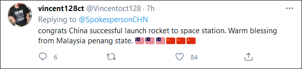 一位马来西亚网友评论获得了最高的点赞数——“祝贺中国成功向空间站发射火箭,这是来自马来西亚的热切祝福。”