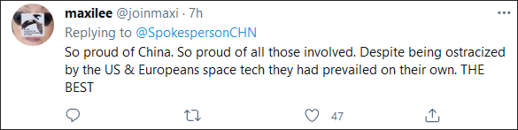 “真为中国感到骄傲,为所有参与其中的人感到骄傲。尽管被美国和欧洲封锁了太空技术,但中国还是靠自己的努力占据了上风。太棒了。”