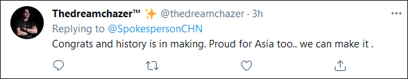 “恭喜,(中国)正创造历史。我为亚洲感到骄傲,我们可以做到。”