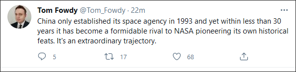 英国政治分析师汤姆·福迪(Tom Fowdy)也颇有感慨地写道,“中国在1993年才成立航天局,但在不到30年的时间里,中国正实现着自己的历史壮举,成为了NASA强劲的竞争对手。这是一个非凡的奇迹。”