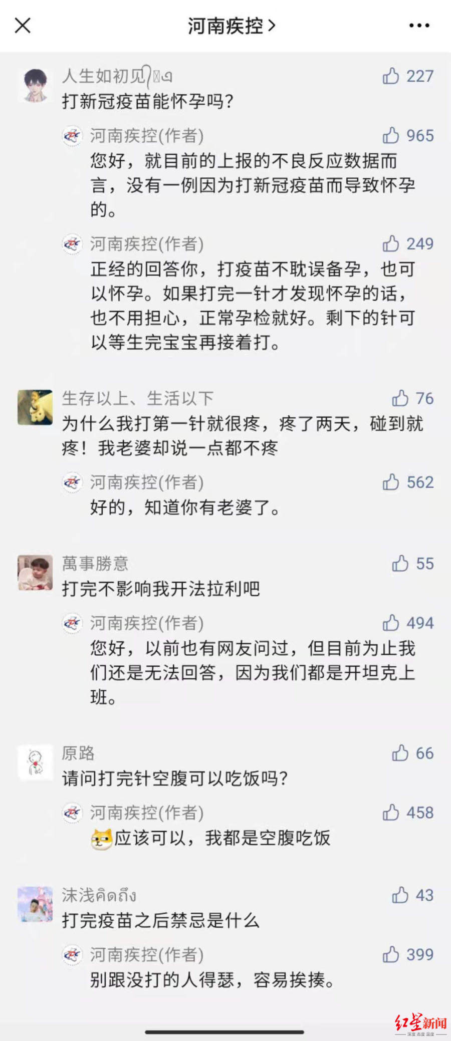 如网友问“打完新冠疫苗后发胖算后遗症吗?”小编回答“我感觉您这不是胖,是对生活过敏造成的肿胀。”如网友问“打了疫苗影响我公主抱对象吗?”其回答“打针时的疼痛能帮您在美梦中醒来。”再如网友问:“打完不影响我开法拉利吧?”其回答:“以前也有网友问过,但目前为止我们还无法回答,因为我们都是开坦克上班。”