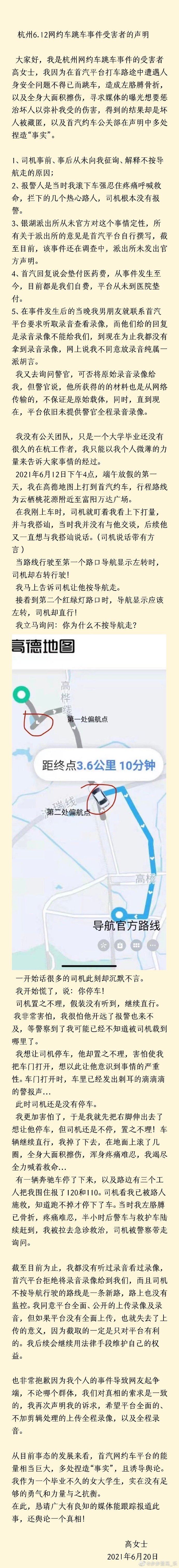 6月20日,@步步登高_乐 再次发声明称,自己打开车门后,车内已有提示音司机却仍未停车,且首汽约车的情况说明与事实有五点不符合。第一,司机从未向其征询、解释不按导航行驶的原因;第二,事发后报警的是路人而非司机;第三,派出所并未定性,关于派出所部分为首汽平台自行撰写;第四,首汽从未到医院垫付医药费;第五,自己一直要求但至今没有看到录音录像。最后她希望首汽平台全面地、不加剪辑地处理上传全程录像和录音。