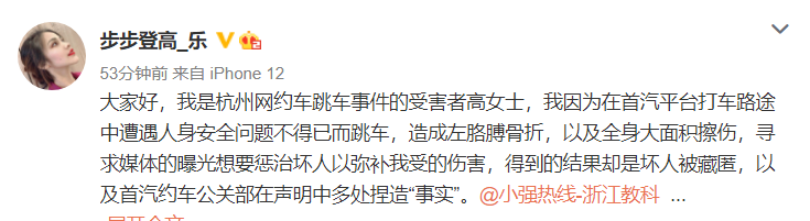 6月12日,杭州的高女士打了一辆首汽约车,司机改路线她跳车摔骨折。6月19日,首汽约车回应女乘客跳车骨折,系沟通不畅所致。