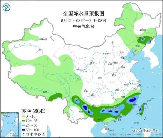 全国降水量预报图(6月21日08时-22日08时)