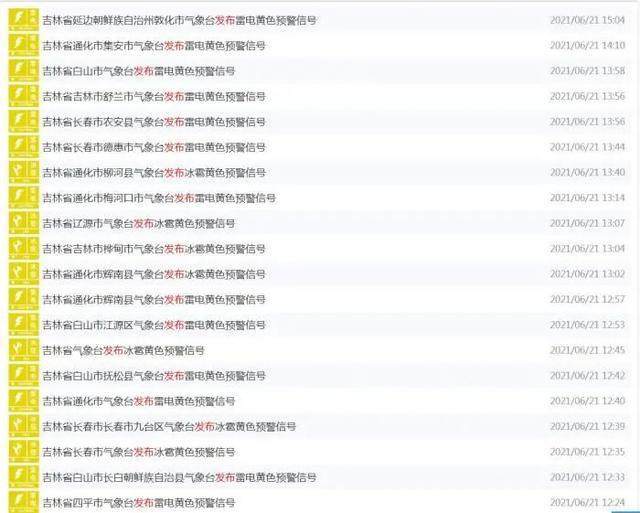 截至21日15时,吉林省已连发44个雷电、冰雹、暴雨气象灾害警报与预警信号。
