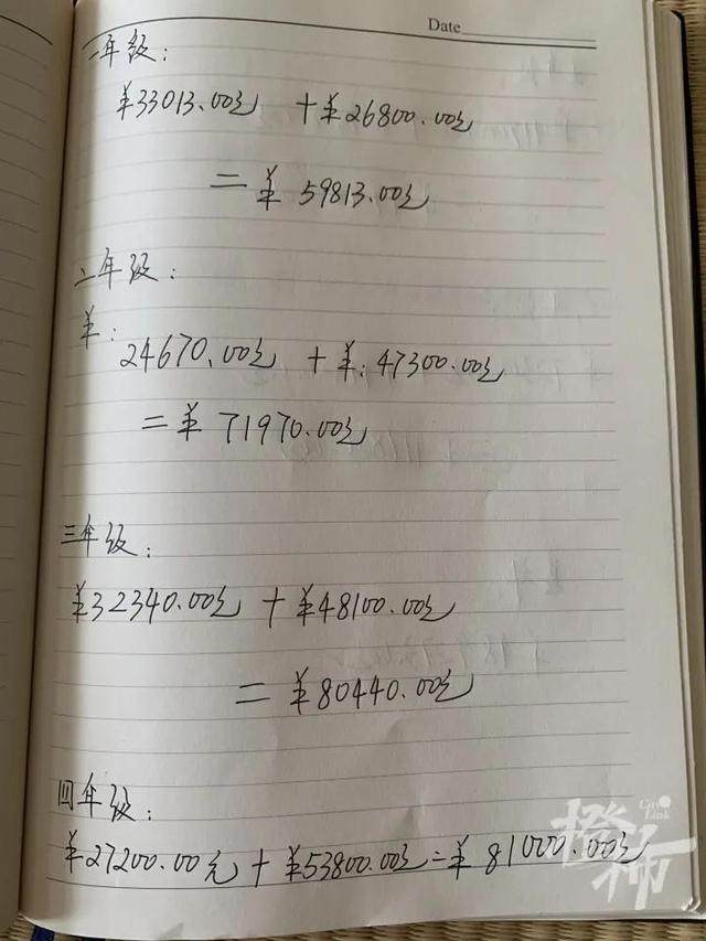 一年级是5.9万元左右,二年级7.2万元左右,三年级8万元左右,四年级8.1万元左右。五年级因为疫情影响,很多兴趣班改为线上,另外一些上门的老师有段时间不能前来,费用稍微节省了一些,花了7.9万元。六年级因为要考级,再加上很多培训费用都在涨价等,支出变多,花了11.7万元。