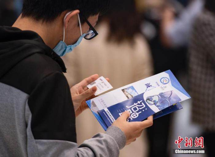 资料图:一名学生在查看招聘单位联系人的名片。中新社记者 侯宇 摄