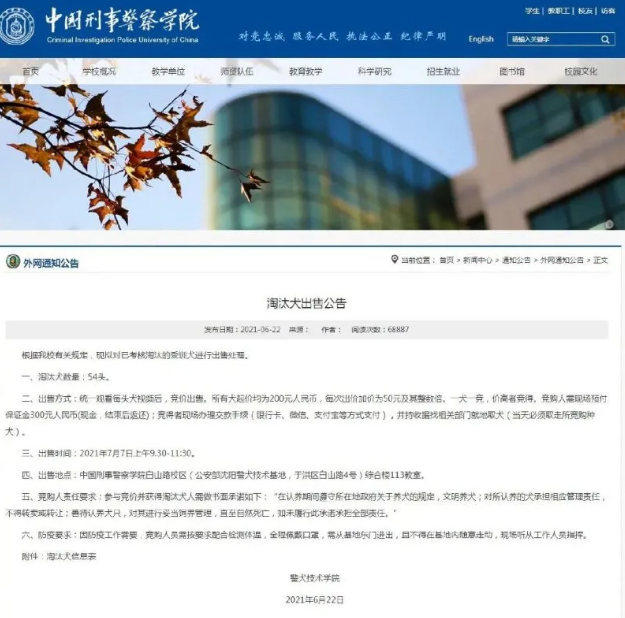 ↑中国刑事警察学院《淘汰犬出售公告》。