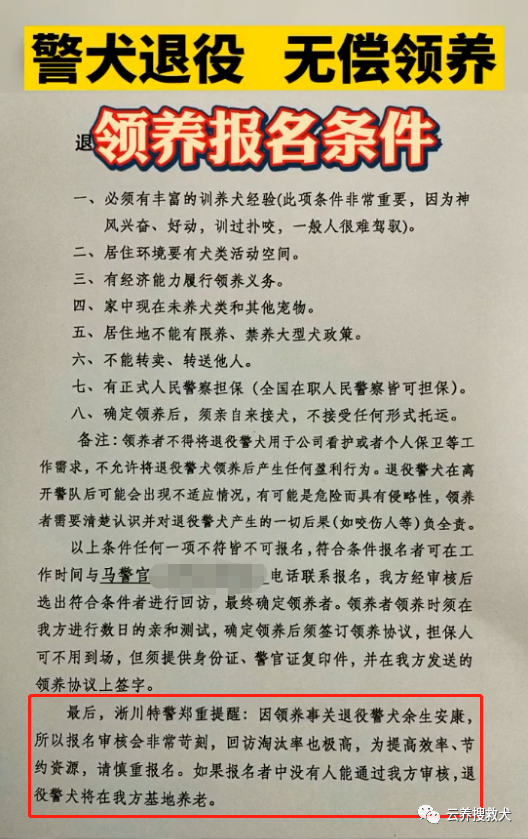 在一张退役警犬领养书上,记者看到,河南省淅川县退役的警犬“神风”曾在网上公开寻找领养。其中对于领养者的要求是:有养犬训犬经验且家庭未养犬;有经济能力(家中有单独院子);居住地不能限养德牧;不能转卖,或送给他人;有正式的人民警察给予担保;领养后,必须亲自来接犬。