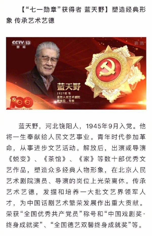 但很少有人知道,蓝天野还是一位优秀的共产党员。他18岁入党,有76年党龄,解放前曾是北平地下党交通员,从事演员工作是听从组织安排,连他的名字“蓝天野”也是因革命而改。可以说,蓝天野将自己的一生都奉献给了党和人民,这样的表演艺术家,称得上“德艺双馨”,配得上七一勋章。