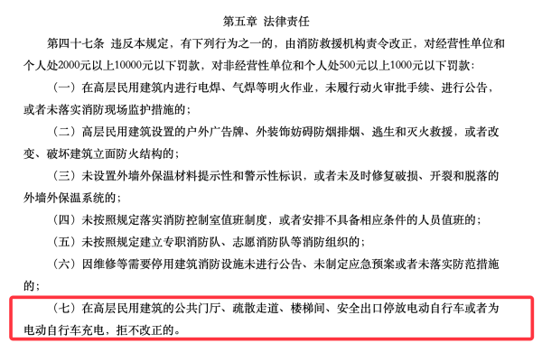 近日,应急管理部公布了《高层民用建筑消防安全管理规定》,其中明确指出,在高层民用建筑公共门厅等地停放电动车或充电,拒不改正的个人,可以由消防救援机构对其处以500元以上1000元以下罚款,对经营性单位和个人,最高可处10000元罚款,自8月1日开始施行。