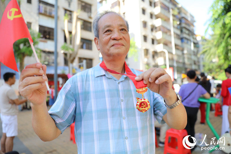 6月27日上午,海南省海口市73岁的老党员王成祥(党龄52年)向记者展示“光荣在党50年”纪念章。人民网 毛雷摄