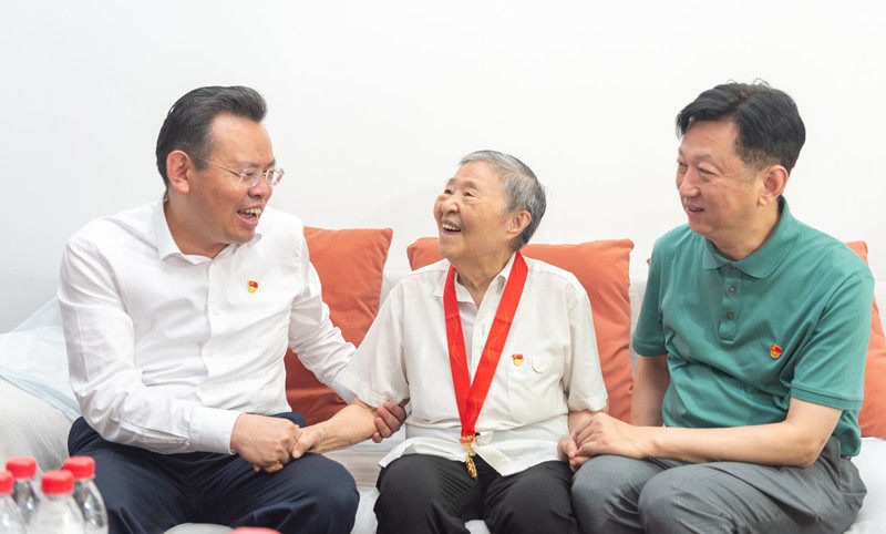6月23日下午,湖北省武汉市。革命先烈蔡和森之女、老党员代表、同济医院离休教授蔡转(党龄65年)获颁“光荣在党50年”纪念章。齐剑东摄