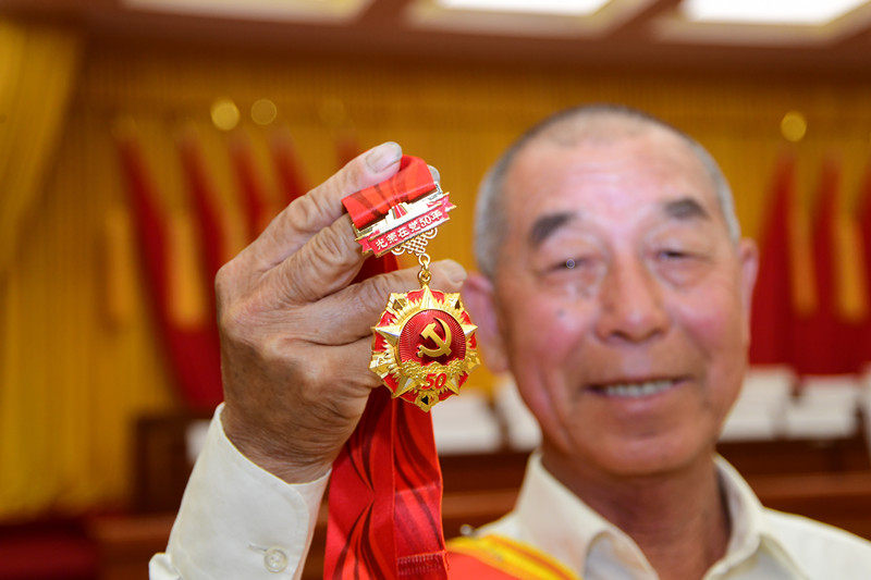 6月18日,河北省怀来县狼山乡六街村老党员刘永福(党龄55年)向记者展示“光荣在党50年”纪念章。孙慧军摄