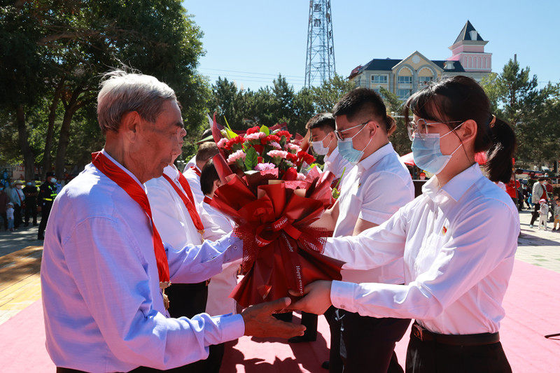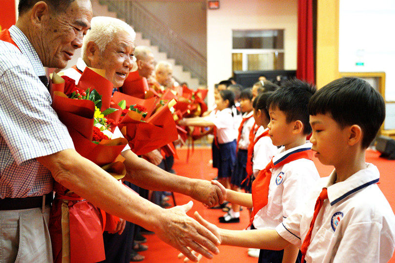 6月9日,广西壮族自治区玉林市福绵区举行“光荣在党50年”纪念章颁发仪式。图为少先队员为老党员献上鲜花。玉林市委组织部供图