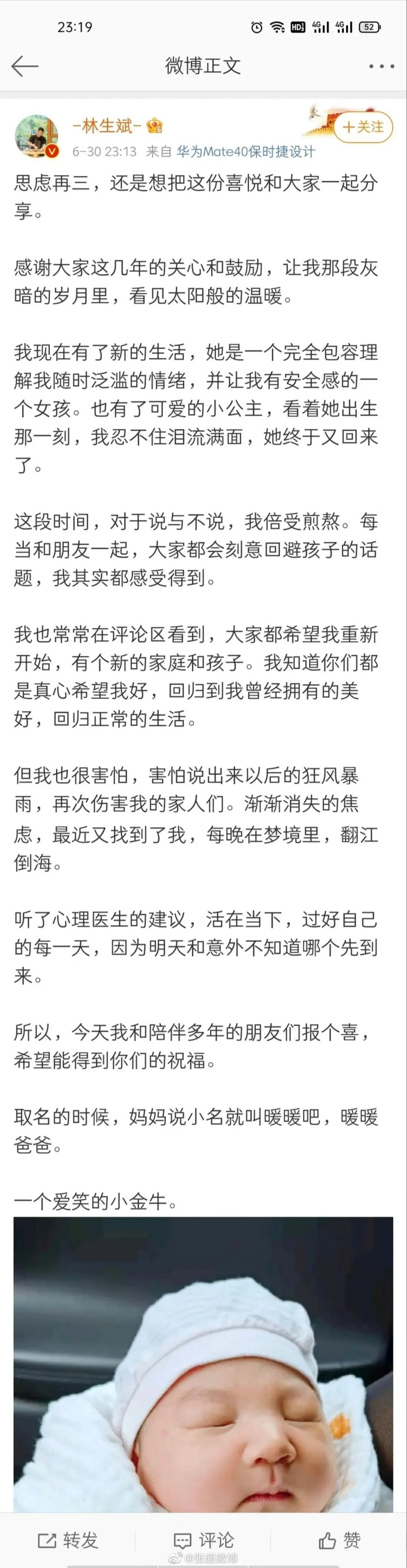 6月30日,“杭州保姆纵火案”的当事男主林生斌在微博宣布,自己已重组家庭并喜得一女,“把这份喜悦和大家一起分享”。