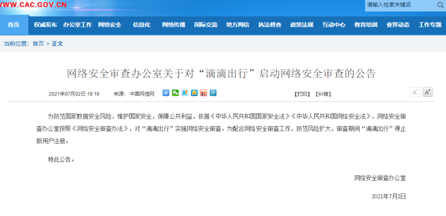 据国家互联网信息办公室网站7月2日消息,为防范国家数据安全风险,维护国家安全,保障公共利益,依据《中华人民共和国国家安全法》《中华人民共和国网络安全法》,网络安全审查办公室按照《网络安全审查办法》,对“滴滴出行”实施网络安全审查。为配合网络安全审查工作,防范风险扩大,审查期间“滴滴出行”停止新用户注册。