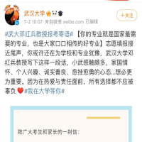 媒体注意到,武汉大学官方微博转发时还进行了点评:“家国情怀、个人兴趣、诚实善良、愈挫愈勇的心态…想必更为重要。因为在热爱与责任面前,所有选择都不应被辜负。”关切之情,溢于言表。