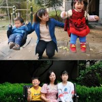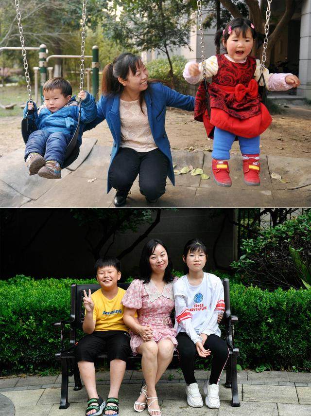 上图:2013年 2月24日,吴菊萍带着儿子陈至轩(左)与妞妞(右)在小区玩荡秋千;下图:2021年7月1日,吴菊萍带着儿子陈至轩(左)与妞妞(右)在小区合影(拼版照片) 新华社记者 黄宗治 摄