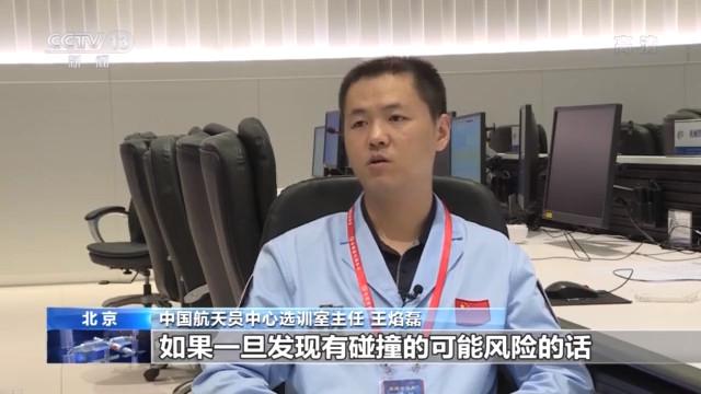 中国航天员科研训练中心选训室主任 王焰磊:一方面是通过我们仿真软件的预警功能,另外一方面,舱外航天员和舱内航天员都有急停装置,舱外的航天员在运动过程中如果一旦发现有碰撞的可能、风险的话,他可以直接按下急停装置,机械臂就会停止工作,也是保证安全的多重手段。