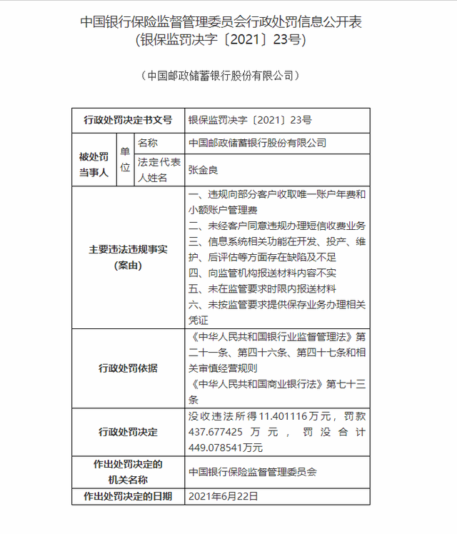 7月5日,中国银行保险监督管理委员会公布的行政处罚信息公开表显示,邮政储蓄银行存在违规向部分客户收取唯一账户年费和小额账户管理费、未经客户同意违规办理短信收费业务等六大违法违规事实,被没收违法所得11.401116万元,罚款437.677425万元,合计449.078541万元。同时,银保监会对邮储银行个人金融部两任总经理作出警告处罚。
