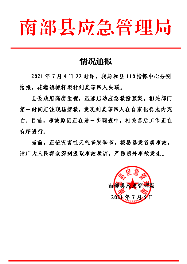 四川南部县委政府迅速启动应急救援预案,相关部门第一时间赶往现场搜救,发现刘某等四人在自家化粪池内死亡。目前,事故原因正在进一步调查中,相关善后工作正在有序进行。