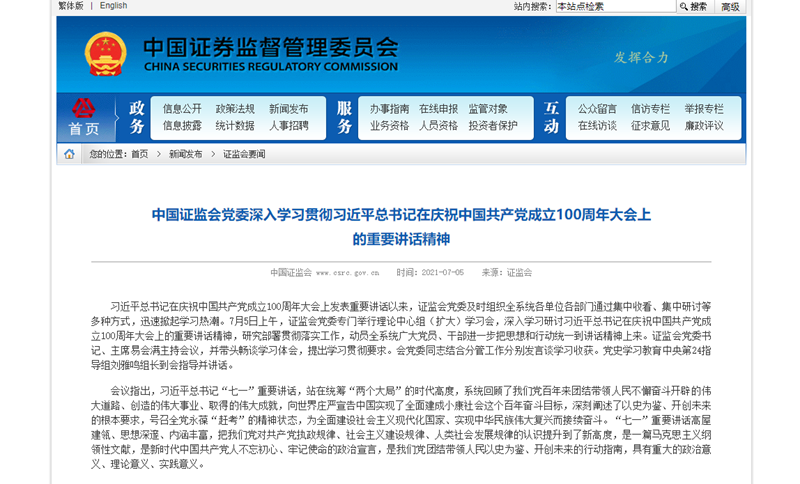 7月5日上午,证监会党委专门举行理论中心组(扩大)学习会,深入学习研讨习近平总书记在庆祝中国共产党成立100周年大会上的重要讲话精神,研究部署贯彻落实工作,动员全系统广大党员、干部进一步把思想和行动统一到讲话精神上来。会议强调,要全面落实“零容忍”方针,推动完善证券执法体制机制,创新科技监管手段,从严打击恶性违法违规行为,有序推进证券纠纷特别代表人诉讼常态化等工作。要全面落实防风险守底线要求,加快健全风险预防、预警、处置、问责机制,严把资本市场入口关,坚决防止资本无序扩张,防范少数人利用资本市场违法违规“造富”。
