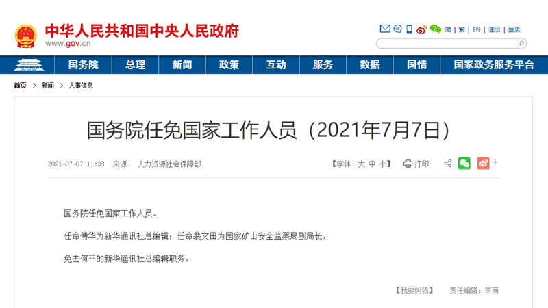 免去何平的新华通讯社总编辑职务。