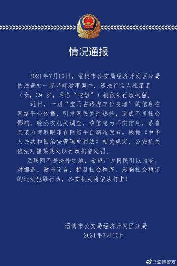 7月10日,山东淄博警方就近日网络热传的“宝马占路虎车位被堵”事件发布通报:经查,该信息为不实信息,系崔某某为博取眼球编造发布。公安机关依法对崔某某处以行政拘留处罚。