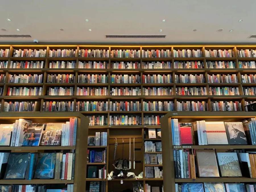 这家书店分地下、地上两部分,地上层分布在三栋建筑的一楼,图书主题是时尚、摄影、美术等,地下层主要是文学、人文、旅游、设计等图书。店内大面积使用落地玻璃,巨大的书架摆满图书,给人强烈的视觉冲击。澎湃新闻在店内发现,靠墙一排书柜上方顾客无法触及处放着大量疑似装饰书,向店员借梯子取时被告知“不用拿,上面都是装饰书,只有外壳。”