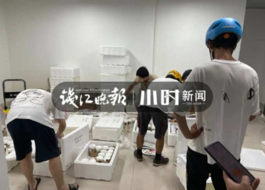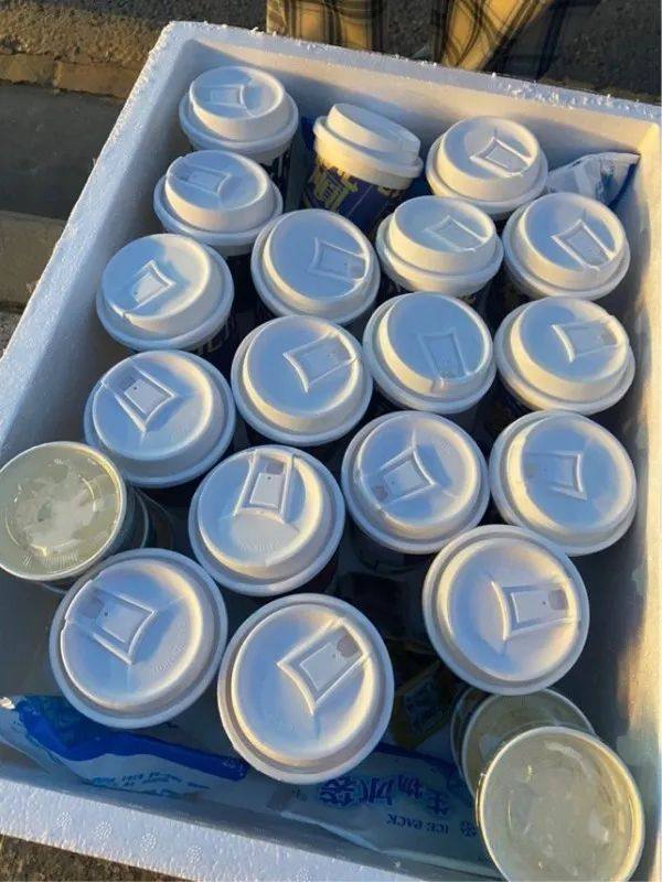 有大约10个泡沫保温箱摊放在地上,里面装着的就是今天的“战利品”——茶颜悦色。数了一下,一个箱子最多装满20杯,能看到已经有不少货被取走了。在泡沫塑料箱中间穿梭着找货的几个小伙子,应该就是代购商们了。