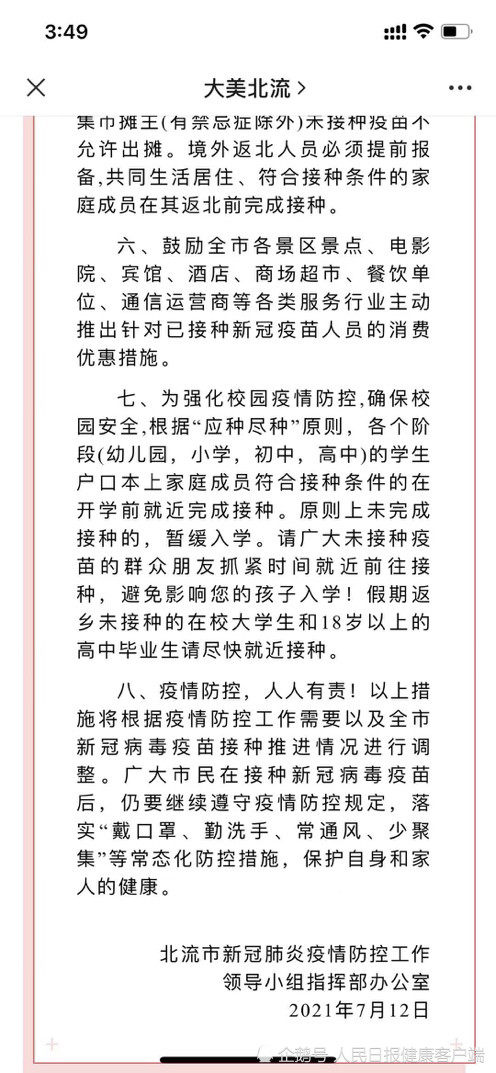 7月12日,广西桂平市新型冠状病毒肺炎疫情防控指挥部发出通告:凡年满18周岁以上(户籍不限)且无疫苗禁忌症的人员均须接种。为强化校园疫情防控,确保校园安全,根据“应种尽种”原则,各个阶段(幼儿园,小学,初中,高中)的学生户口本上家庭成员符合接种条件的在开学前就近完成接种。原则上未完成接种的,暂缓入学。