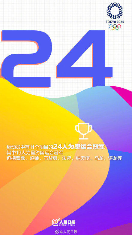 在参加东京奥运的431名运动员中,有11个项目的24位奥运冠军,其中朱婷、马龙、钟天使、赵帅等19人为里约奥运会冠军。