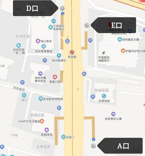 东大街站A出入口位于紫荆山路与书院街交叉口东北角。