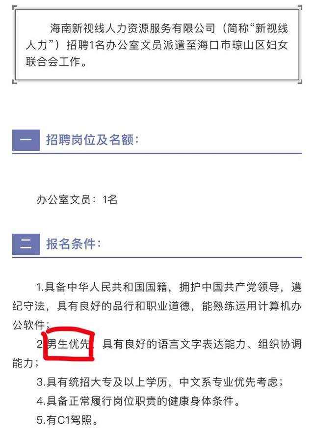 7月14日,一则由海南新视线人力资源服务有限公司代发的招聘启事,引发了不少网友的关注。在这则启事中,一个由海口市琼山区妇联招聘的“办公室文员”岗位,在报名条件的第二条明确写着“男性优先”。长期以来,舆论对职场上的性别不平等问题高度关注,在招聘中设立“性别门槛”的做法,往往会受到舆论的严肃审视。而今,本该维护妇女群体劳动权益的地方妇联,却发布了这样一份宣称“男性优先”的招聘启事,无疑显得十分讽刺,也因此引发了广泛质疑。